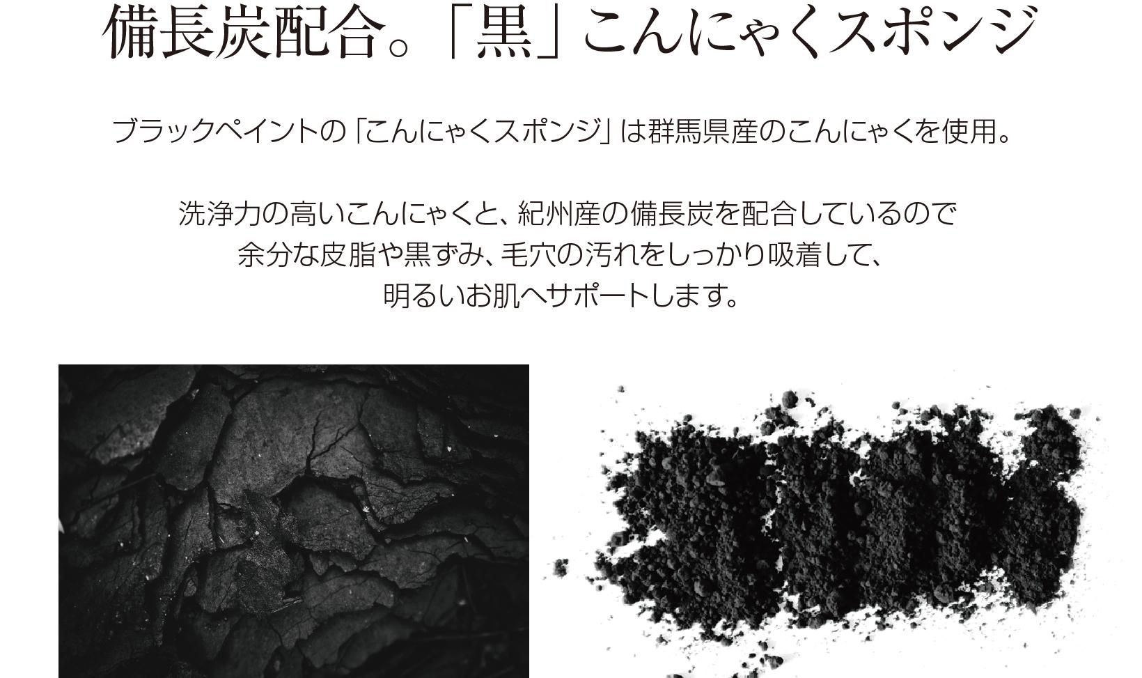 Black Paint.(ブラックペイント)のこんにゃくスポンジは群馬県産のこんにゃくを使用。 洗浄力の高いこんにゃくと、紀州産の備長炭を配合しているので、余分な皮脂や黒ずみ、毛穴の汚れをしっかり吸着して、明るいお肌へサポートします。