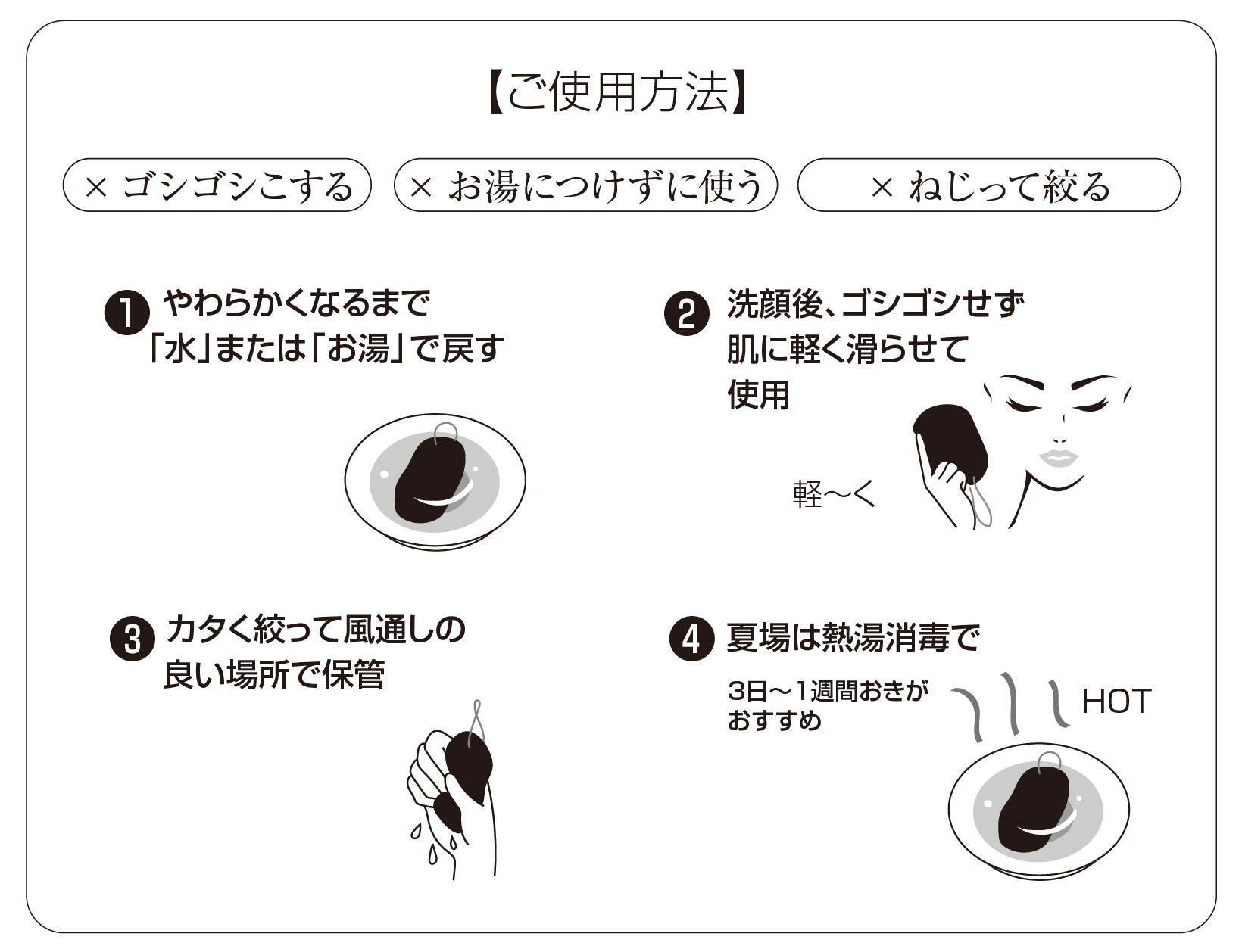 防腐剤や抗菌剤、石油由来成分を一切使用せず、凍結乾燥したこんにゃくのみを使用したスポンジです。 乳酸菌配合の石鹸ケアの後に、お湯で戻したスポンジを肌に優しく撫でるように使うだけ!
